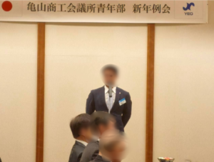 1月23日に開催されました、津北支店が所属している亀山商工会議所青年部の新年例会に参加してきました。今回は、弊社社員が運営の司会を務め、亀山の企業様と交流を深めてまいりました。